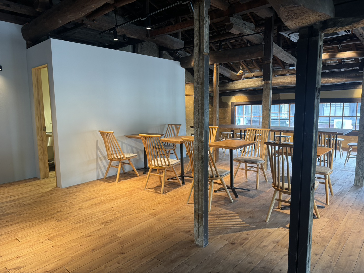 露出配線を最小限に抑えつつ、既存構造体に無理な負担をかけないよう施工方法を工夫。古い木材と新しい電線・器具が自然に共存する空間を実現しています。